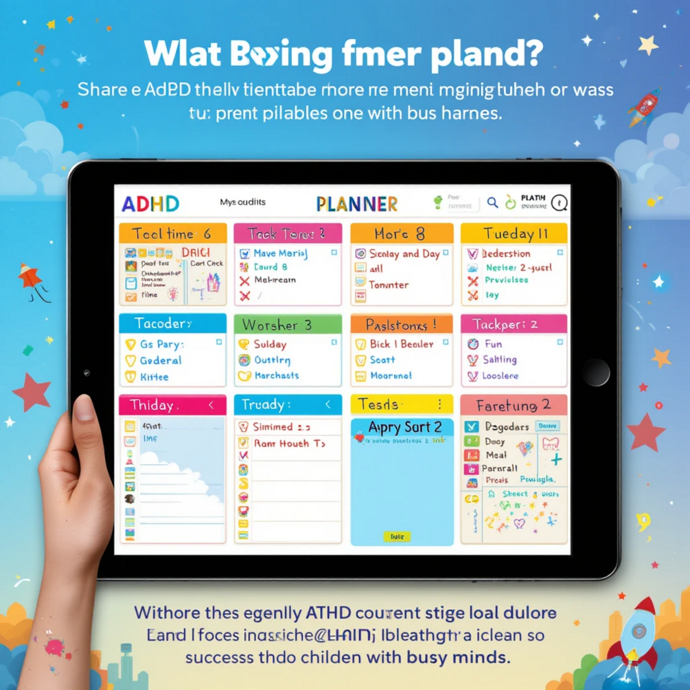 Introducing the ADHD Planner for Kids. A fun and engaging tool designed to help young minds thrive. Packed with colorful visuals and interactive elements, this planner makes organization a breeze while encouraging focus and creativity. Perfect for kids with ADHD, it empowers them to manage their daily tasks, set goals, and celebrate achievements in a way that feels exciting and achievable. Let's turn chaos into clarity grab your digital ADHD Planner for Kids today and watch your child's productivity soar.